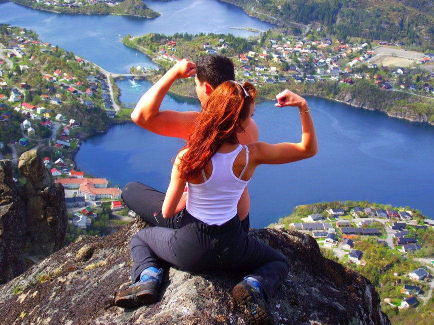 Dalszą ciekawostką Svolvær’u jest Svolværgeita, (w dosownym tłumaczeniu oznacza Kozę Svolværu), której charakterystyczny kształt przypomina właśnie kozie rogi. Góra jest po prostu monumentalna i to właśnie ona przyciąga tysiące turystów, zapewniając dreszczyk emocji i adrenaliny nie do opisania. Dlaczego? Otóż, wielu ludzi przyjeżdża tu tylko po to żeby przeskoczyć z jednego rogu słynnej kozicy, na drugi! Szaleństwo. Svolværgeita znajduję się na wysokości 150 metrów nad poziomem morza i otaczają ją skały, które nie zatrzymują dziesiątki szaleńcow mających na celu przeskoczyć cudowny wierzchołek góry. Oczywiście nie wszystkie próby kończą się pomyślnie i niejeden niestety nie wrócił już do domu. Jednak dużo śmiałków podejmuje wyzwanie z uwieńczonym sukcesem. Najmłodszy skoczek któremu udało sie przeskoczyć i przeżyć, miał zaledwie 8 lat! Mnie najbardziej zaskoczył dokument o nieustraszonych norwegach, którzy mężnie przejechali na drugą stronę ROWEREM. Popularnością cieszy się również slackline, paragliding lub skok ze spadochronem. My natomiast weszlismy na równoległy szczyt żeby móc podziwiać to piękno natury z daleka. Oczywiście mr Zdeno planuje dobicie tego wierzchołka- ale póki co nie ze mną. ?