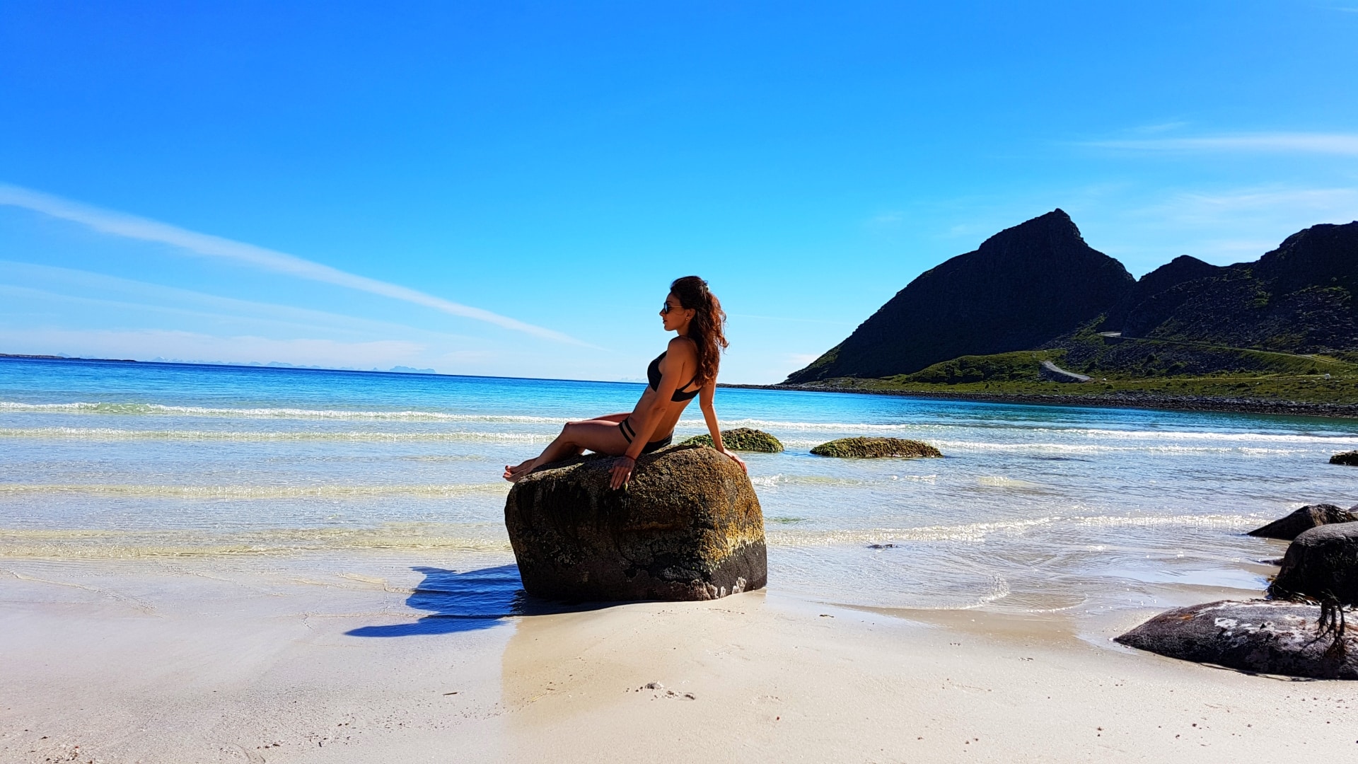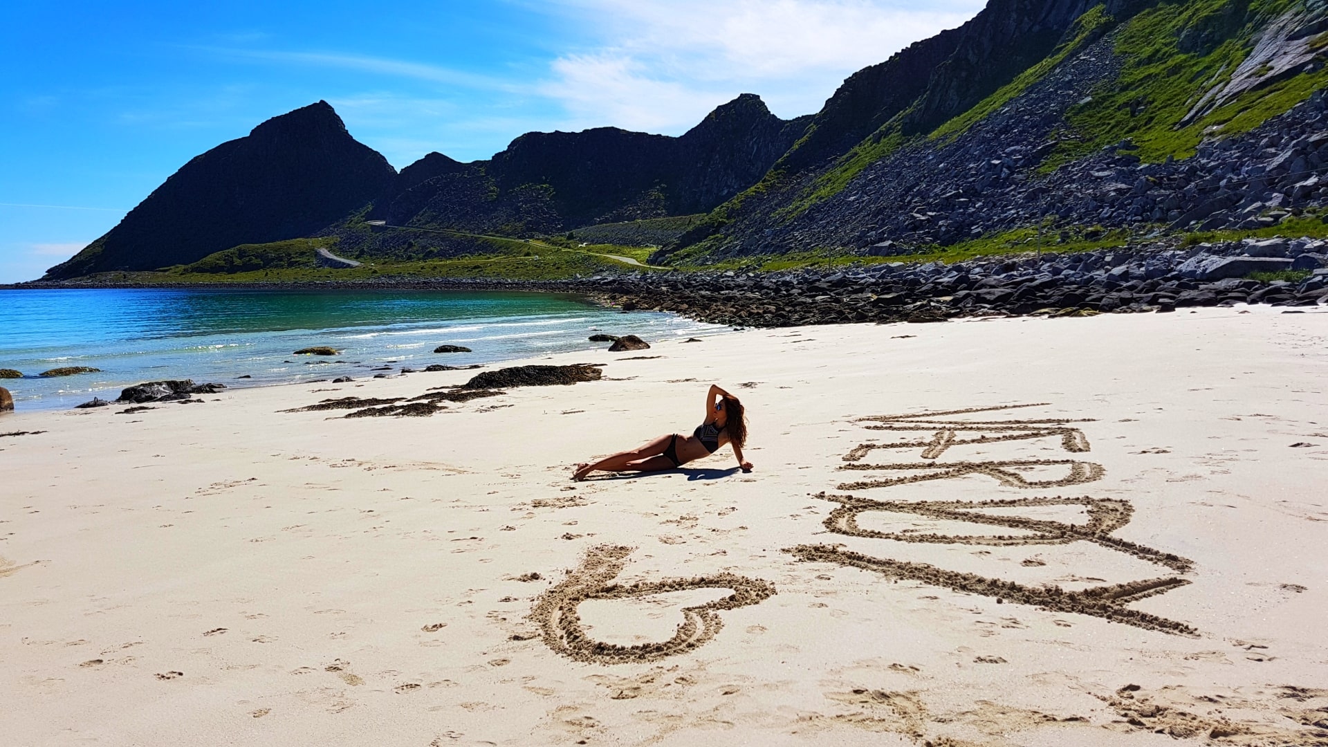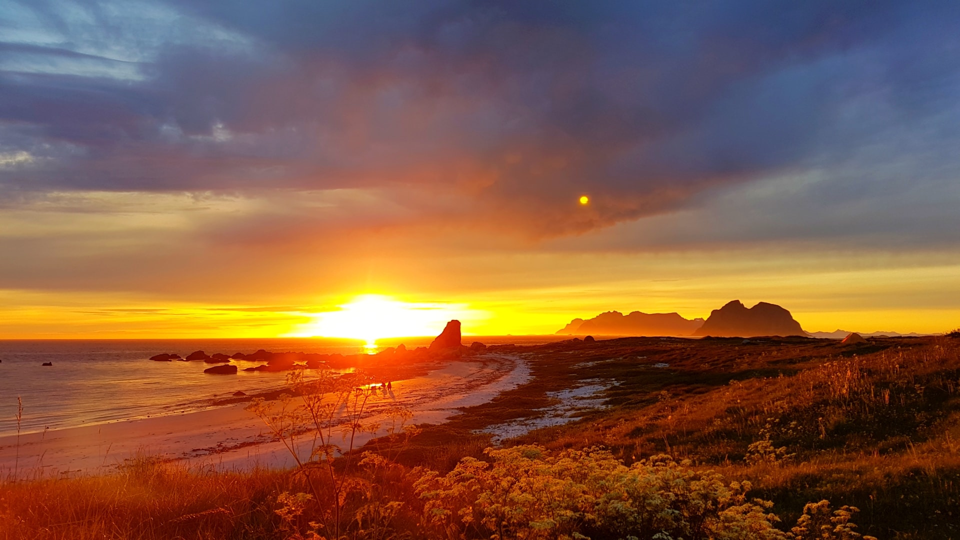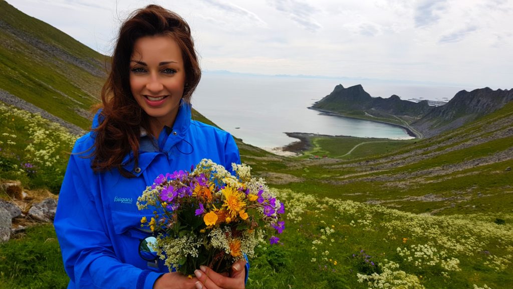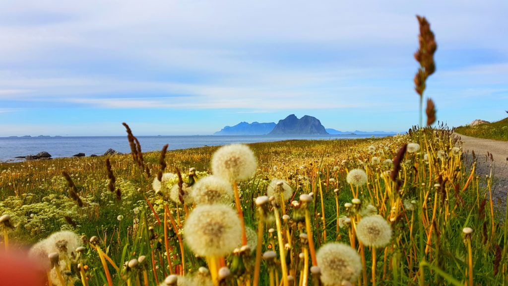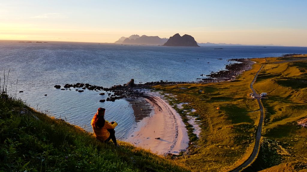 Gdy dojechaliśmy na miejsce była godzina 22.00. Plaża była już idealnie oświetlona nisko osadzonym arktycznym słońcem. O dziwo nie biały piasek zrobił na nas największe wrażenie ale soczyście zielone łąki pokrywające stoki górskie kończące się u podnóży cudownej plaży. Ponadto, dmuchawce zdobiły trawę niczym delikatny naturalny dywan. Poczułam wiosnę, bo w Polsce dmuchawce są na przełomie kwietnia/maja a tu pod koniec czerwca! Po przybyciu przebraliśmy się, najedliśmy i czym prędzej zaczęliśmy nasz trekking z widokiem na naszą plażę. Spieszyliśmy się gdyż chcieliśmy być na wierzchołku góry dokładnie o północy, witając królową sezonu letniego samą jej magiczną mość północne słońce w swojej najlepszej okazałości.