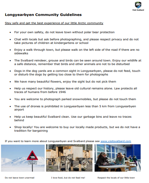 - Komunikacja i marketing– powinien skupiać się głównie na turystach o takich samych wartościach jak mieszkańcy archipelagu, oraz ograniczyć używanie niedźwiedzia polarnego jako symbolu w marketingu wysp. Przypadkowy turysta nie powinien odwiedzać wysp, ale turysta mający podobne zainteresowania i wartości do mieszkańców Svalbardu.