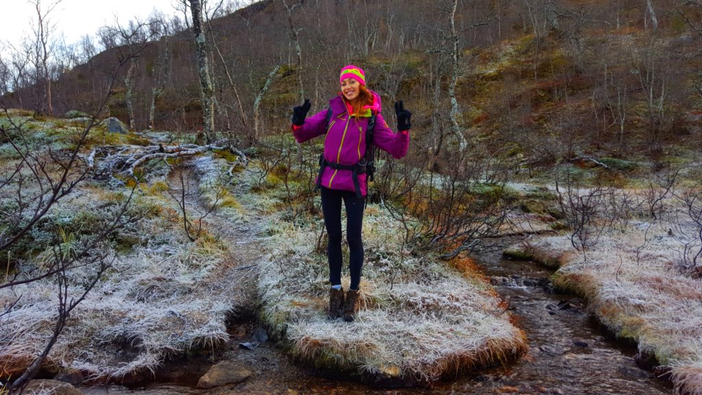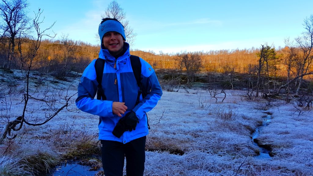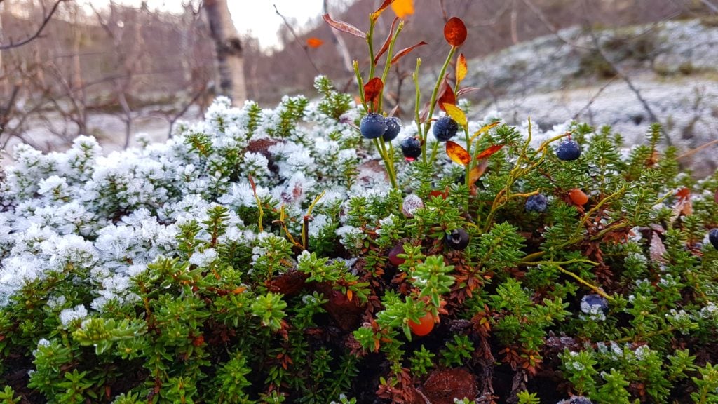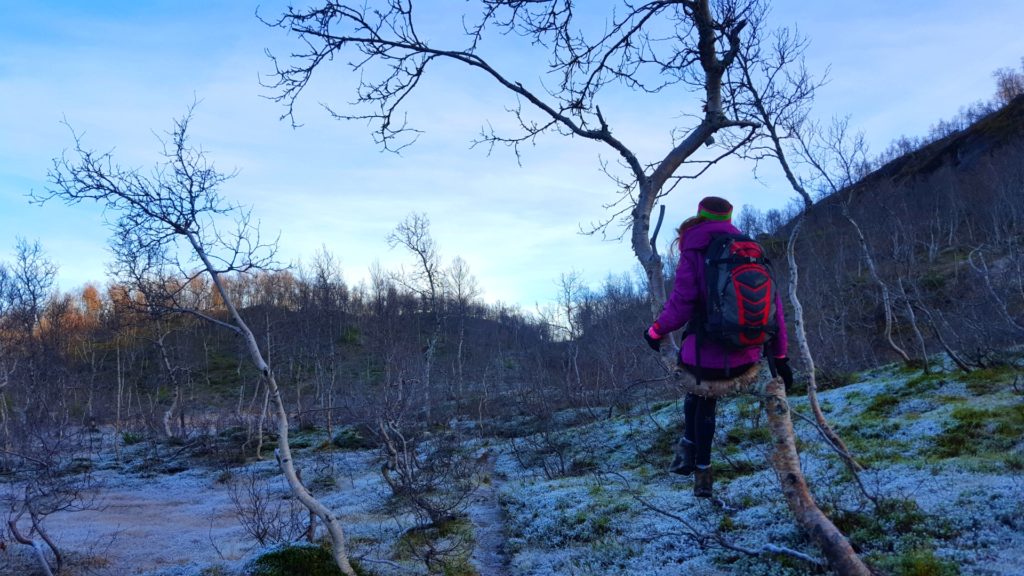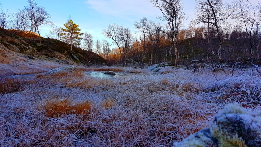 Rago charakteryzuje typowy północno norweski klimat nadmorski z dużą ilością opadów, chłodnymi latami i łagodnymi zimami. Z racji tego, iż park w całości otoczony jest masywem gór, od końca września do końca lutego, słońce w ogóle nie pojawia się w dolinie! Tym samym doświadczyliśmy już pierwsze przymrozki i zamarznięte tafle kałuż, rzek i jezior (i to niecałe dwa tygodnie temu!). Na własnej skórze poczułam nadchodzącą milowymi krokami zimę! Najlepszym widokiem byly jeszcze zielone krzaczki z jagodami, przykryte niczym „milky way“ pierwszą warstwą delikatnego przymrozku- o dziwo były dwa razy słodsze niż normalnie!