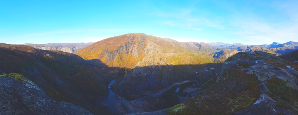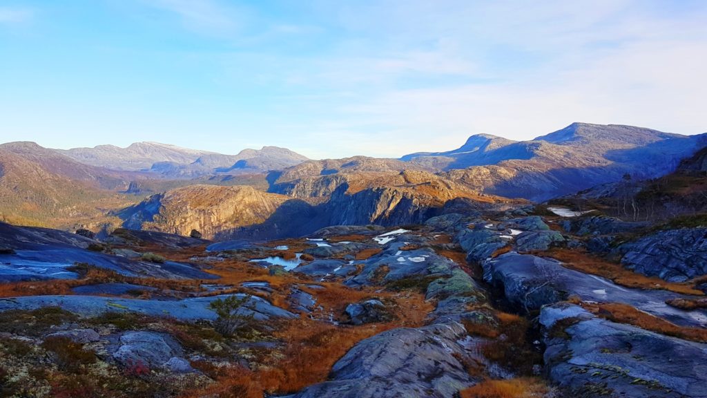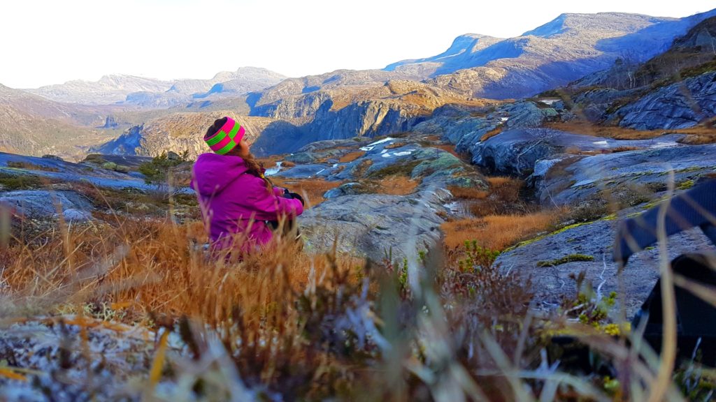 Idąc masywem górskim zapadaliśmy się w błocie (raz nawet po same kolana 😛 ) do tego stopnia, że ciężko było się z niego wydostać. Z racji tego, iż większość bagien była niewidoczna poprzez porośnięte i szczętnie ukryte, czyhające na zbłądzonego turystę zarośla- bagna co chwilę nas zaskakwiały i utrydniały hiking. Teren zmieniał się równie szybko i nie bez powodu określenie „Ragowska mila“ w Norwegii oznacza szczególnie wymagający szlak turystyczny z terenem dwa razy dłuższym, niż jakikolwiek inny.