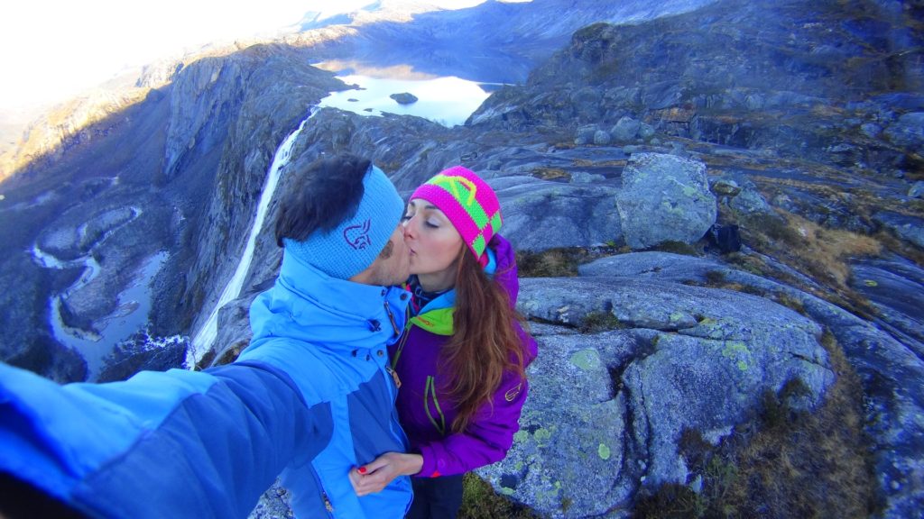 Jak tylko doszliśmy do wodospadu, Zdeno zabrał się za filmowanie. Problem w tym, że było tam zbyt zimno aby dron mógł bezpiecznie wystartować i bezproblemowo polatać. Dlatego, przez pierwszych 10 minut Zdeno ogrzewał baterie (i moje zlodowaciałe, kościste ręce) na swoim brzuchu. Co ja bym zrobiła bez mojego przenośnego grzejniczka w postaci naturalnych zasobów energii mojego męża! Haha