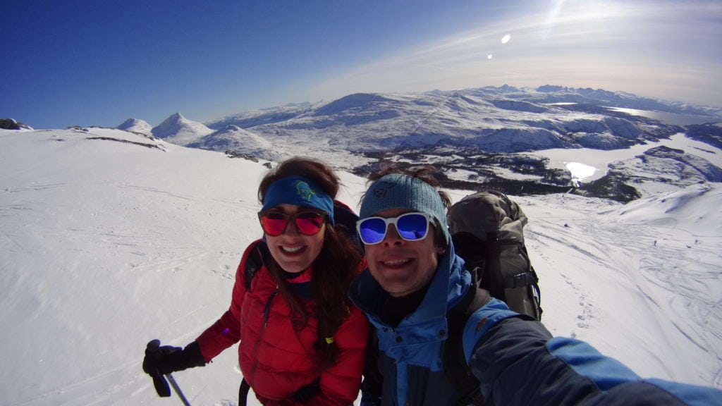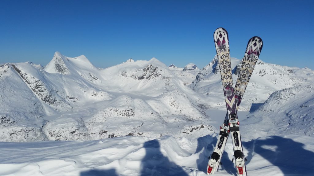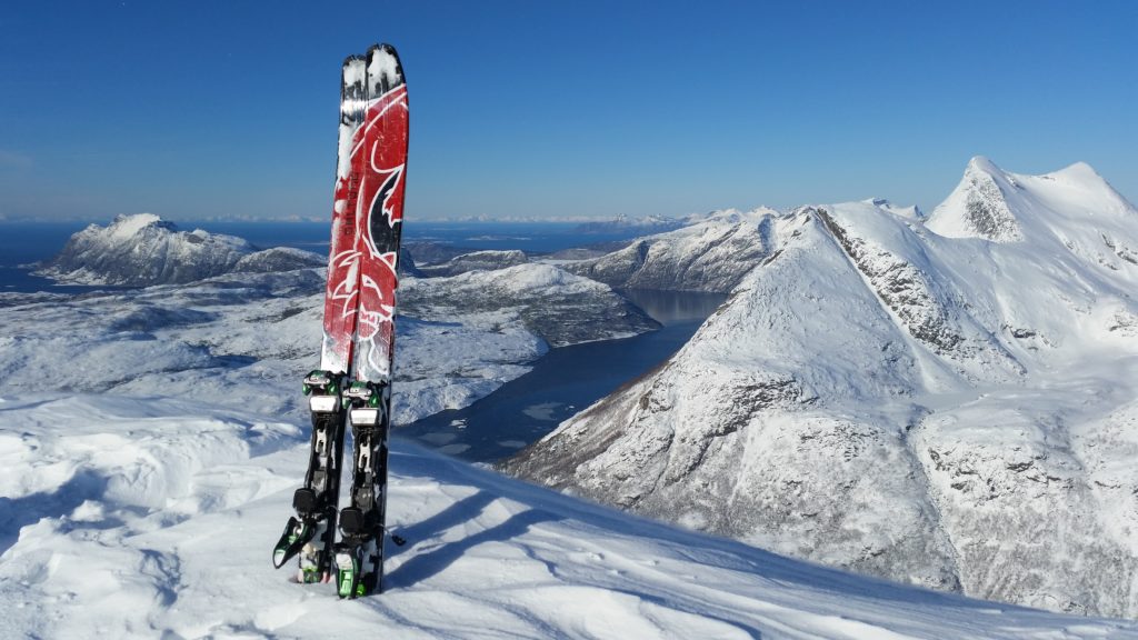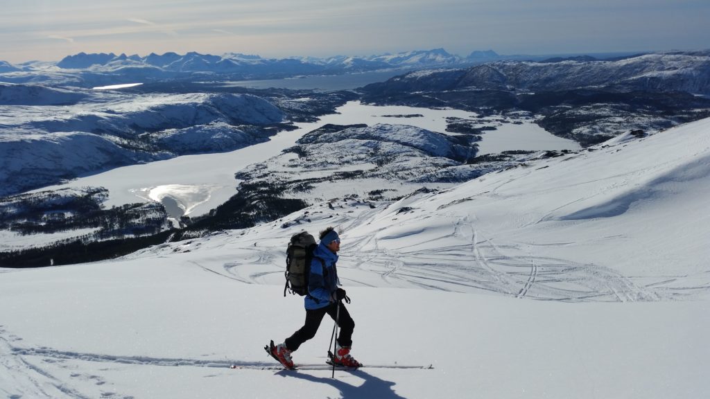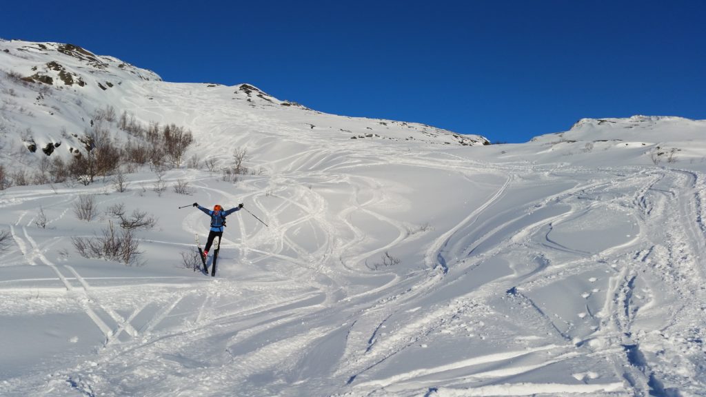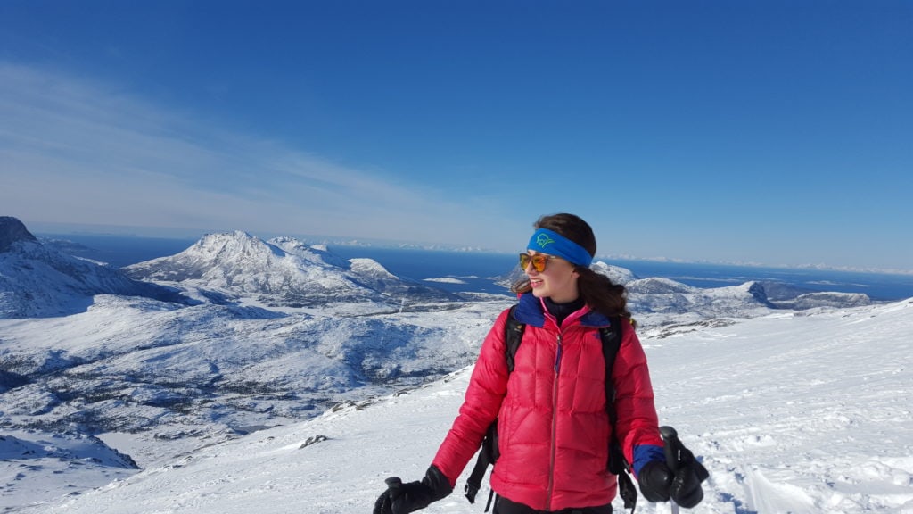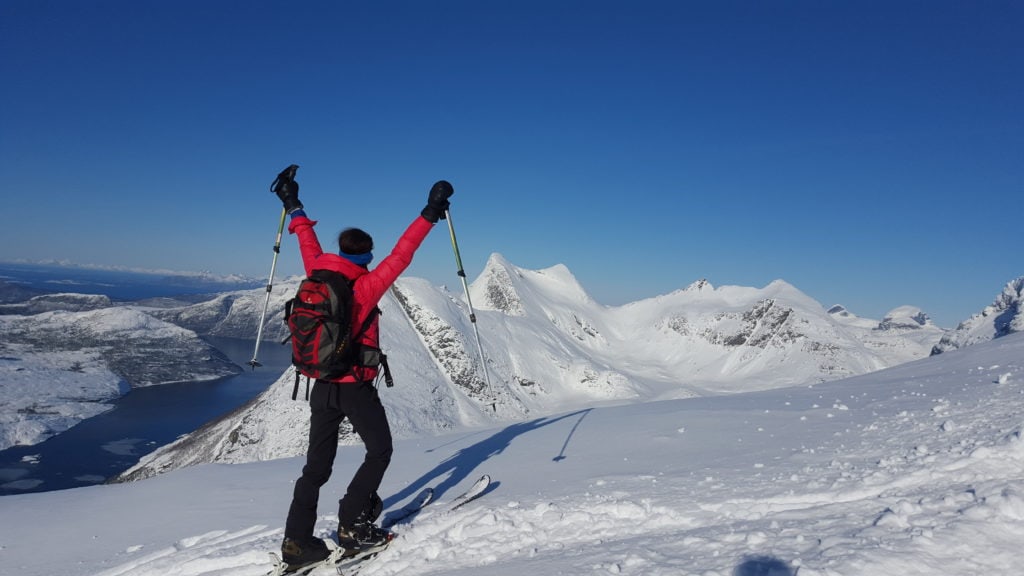 Trasa nie jest tak popularna, jak inne w tej okolicy. Podczas całej wyprawy spotkaliśmy na stoku ok 8 osób. Jednego śmiałka nawet na biegówkach na samym szczycie, co dodało mi odwagi bo było trochę stromo przy zjeżdżaniu. Dobijając szczyt nie spodziewałam się aż tak monumentanego widoku. Ok 100m przed wierzchołkiem, otworzył się widok na stronę zachodnią pokazując bieluteńkie góry zalane granatowo- czarnym fiordem. W oddali ocean, a z nim moje przeukochane Lofoty. Jak budziłam się rano nie pomyślałabym, że taki widok będzie mnie dzisiaj czekał. Czuję się jak w BAJCE!
