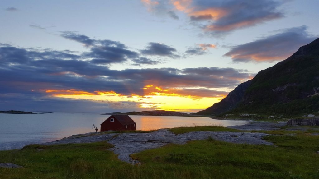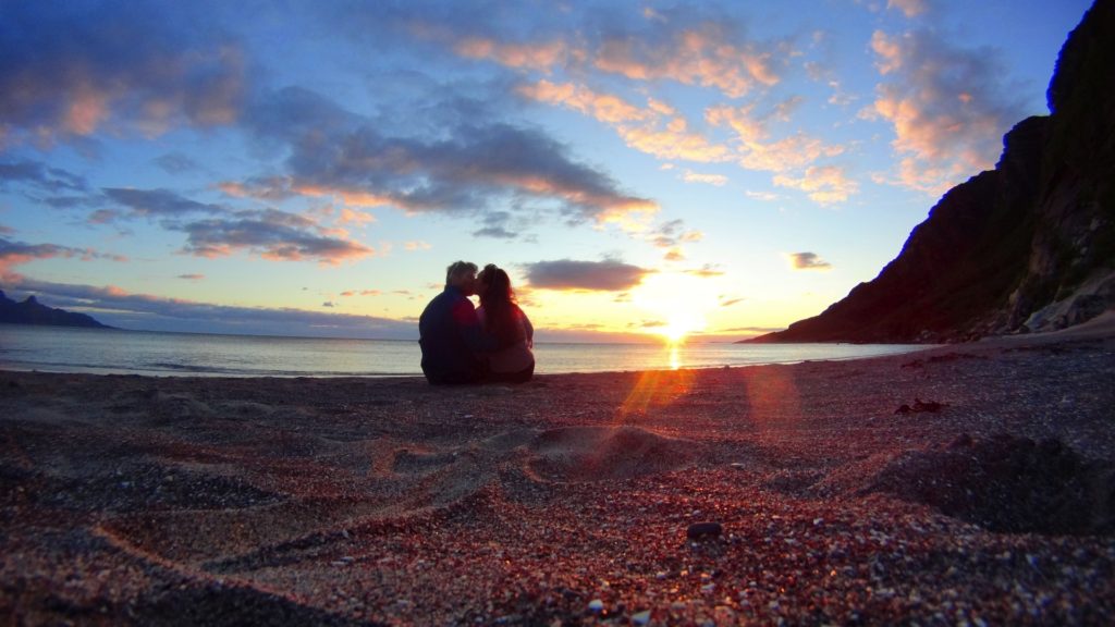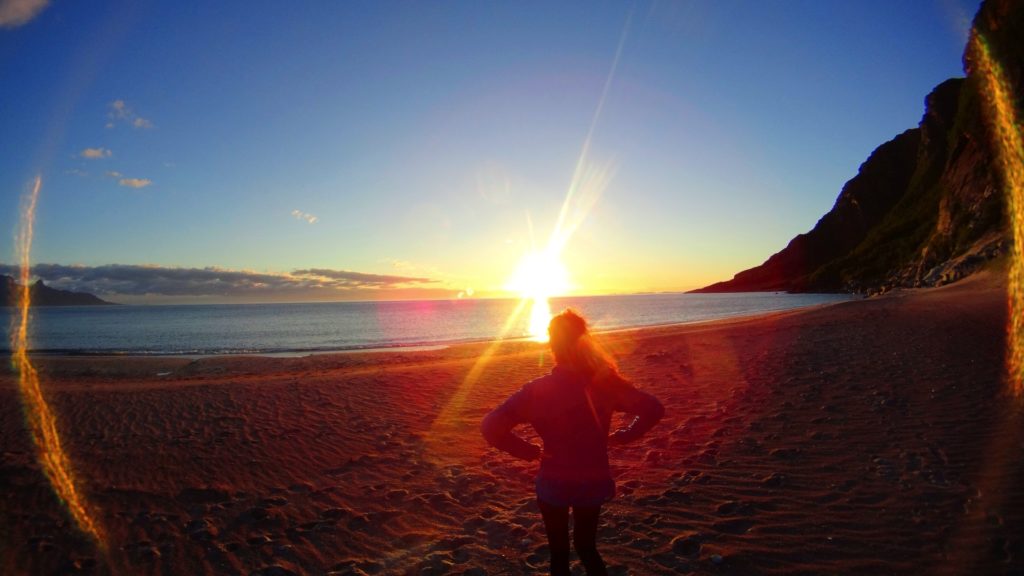 Długość linii brzegowej Norwegii stwarza niepowtarzalną okazję przeżycia cudownych chwil na bezludnych piaszczystych plażach, a możliwość obserwowania światła dnia polarnego odbijającego sie od morza czyni spacer jeszcze bardziej atrakcyjnym! Po dotarciu na doskonale schowaną piaszczystą plażę, okazało się że w oddali są już turyści, gdzie mieli rozbity niewielki namiot, ale w ogóle nam to nie przeszkadzało.