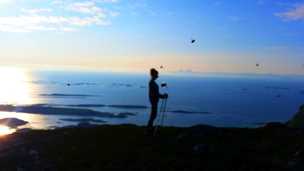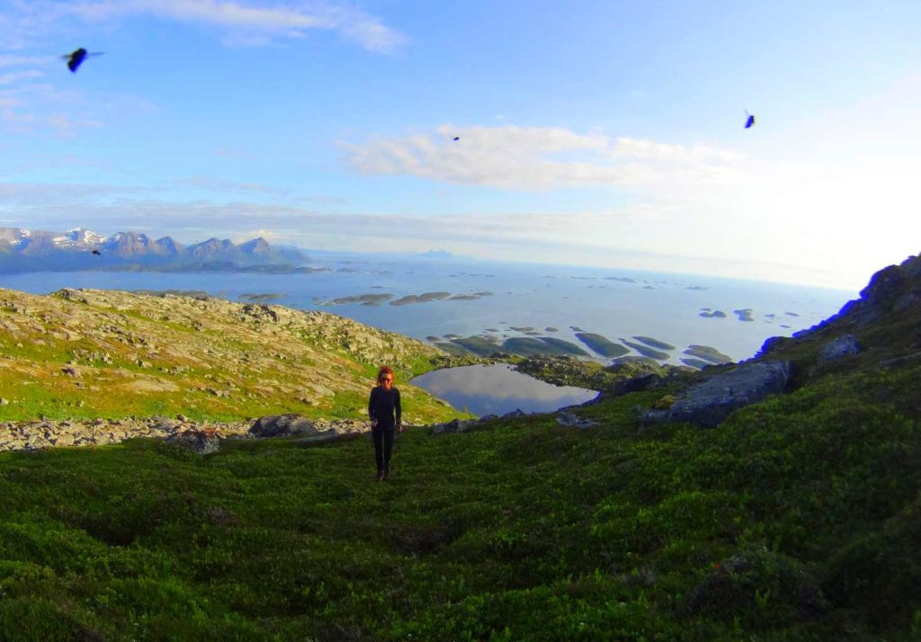 Wyczekiwane zbawienie nadeszło wraz ze szczytem, gdzie delikatny powiew wiatru zafundował nam dawkę ulgi i bezcennego, chwilowego wytchnienia. Dzięki temu mogłam chociaż przez te pare chwil delektować się widokiem bezkresnego Oceanu Arktycznego w oddali z wystającym (moim ukochanym) archipelagiem wysp Lofoty. Zachwycona tym widokiem, wpatrywałam się w niebieską tafę wody, starając się podświadomie wyłączyć dźwięk brzęczących nad moją głową much. Po chwili wiatr niestety ustał, opuszczając nas. Wraz z nim opuściła mnie nadzieja, na radość z wycieczki, jednak w głębi mojej duszy panował spokój, jak w oku cyklonu.